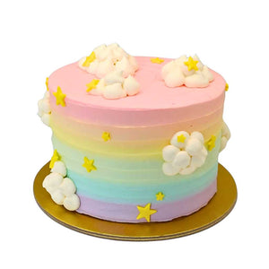 Celebrate your little one's big milestone with a cake as magical as their first year! Our Over the Rainbow Cake features pastel rainbow layers frosted with soft white buttercream clouds and topped with cheerful yellow stars. It's a sweet, whimsical centrepiece that's perfect for first birthdays — full of colour, charm, and joy in every slice!