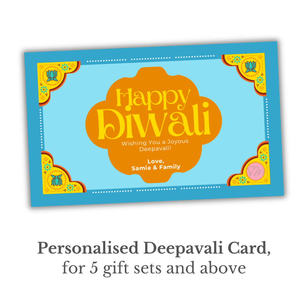 *Personalisation of cards are only for orders of 5 twin packs or more. You will receive a Standard Deepavali Card if you are purchasing less than 5 gift sets. Additionally, Standard Cards will be provided for those who are eligible for personalised cards but did not put any message.