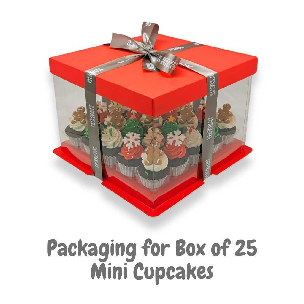 • 25 mini cupcakes are packed in a transparent box measuring 20.5cm (L) x 20.5cm (W) x 17cm (H).