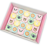 Celebrate with Bunny & Friends cupcakes, featuring charming pastel fondant animals like bear, koala, panda, bunny, and lion. These standard-sized cupcakes add a fun and delightful touch to birthdays, school events, or any gathering for animal lovers.