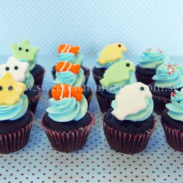 With the cutest under the sea theme with blue swirls, these cupcakes will charm their way through a little boy's heart with little "Nemo" clownfish, starfish and seahorses.