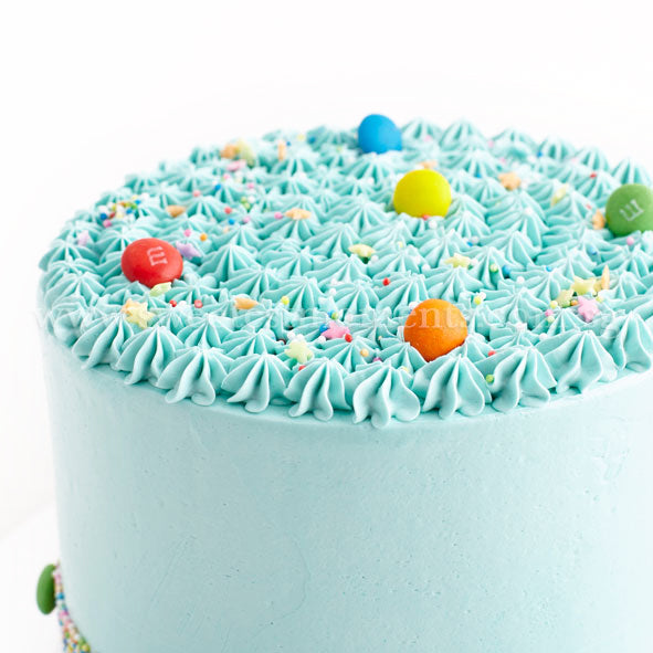 Discover the Rainbow Dotty Cake - a delightfully delicious buttercream cake with a lovely pattern of chocolate balls and rainbow sprinkles. Its vibrant and cute design makes it perfect for any occasion, making it a simple yet stylish addition to your special celebration.