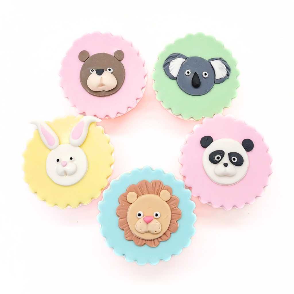 Celebrate with Bunny & Friends cupcakes, featuring charming pastel fondant animals like bear, koala, panda, bunny, and lion. These standard-sized cupcakes add a fun and delightful touch to birthdays, school events, or any gathering for animal lovers.