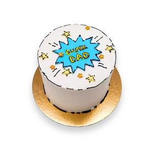 Surprise Dad with this charming 4-inch cake that’s small in size but big on flavour and love. Frosted in smooth, creamy white buttercream frosting, the top features a playful comic-style “Super Dad” graphic in vibrant blue and yellow, surrounded by hand-drawn stars and bold action lines—just like a page out of a superhero comic book.