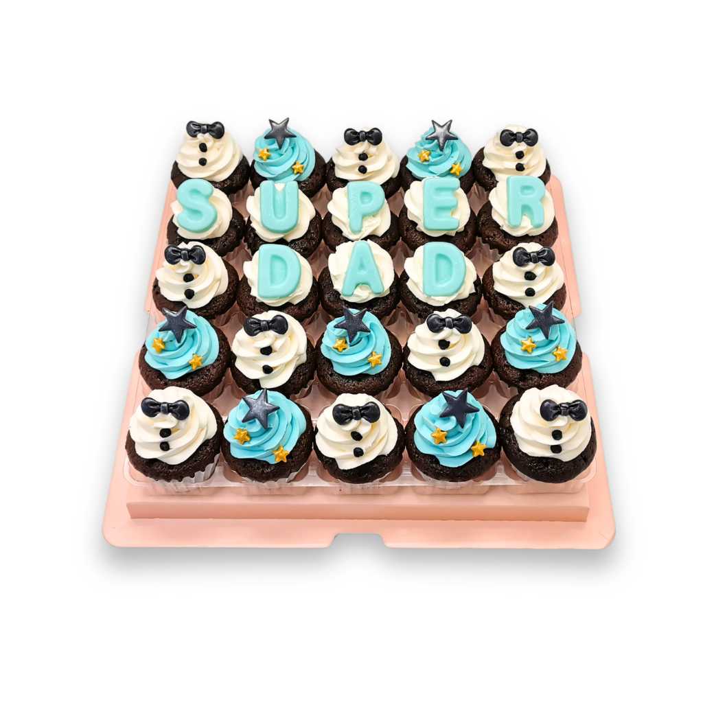 - 25 mini cupcakes in either Chocolate Moist, Fluffy Vanilla or Assorted flavours with the standard message "Super Dad" in blue chocolate alphabets