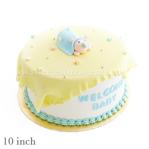 Welcome your baby with this cake featuring a baby peeping out under a blanket.